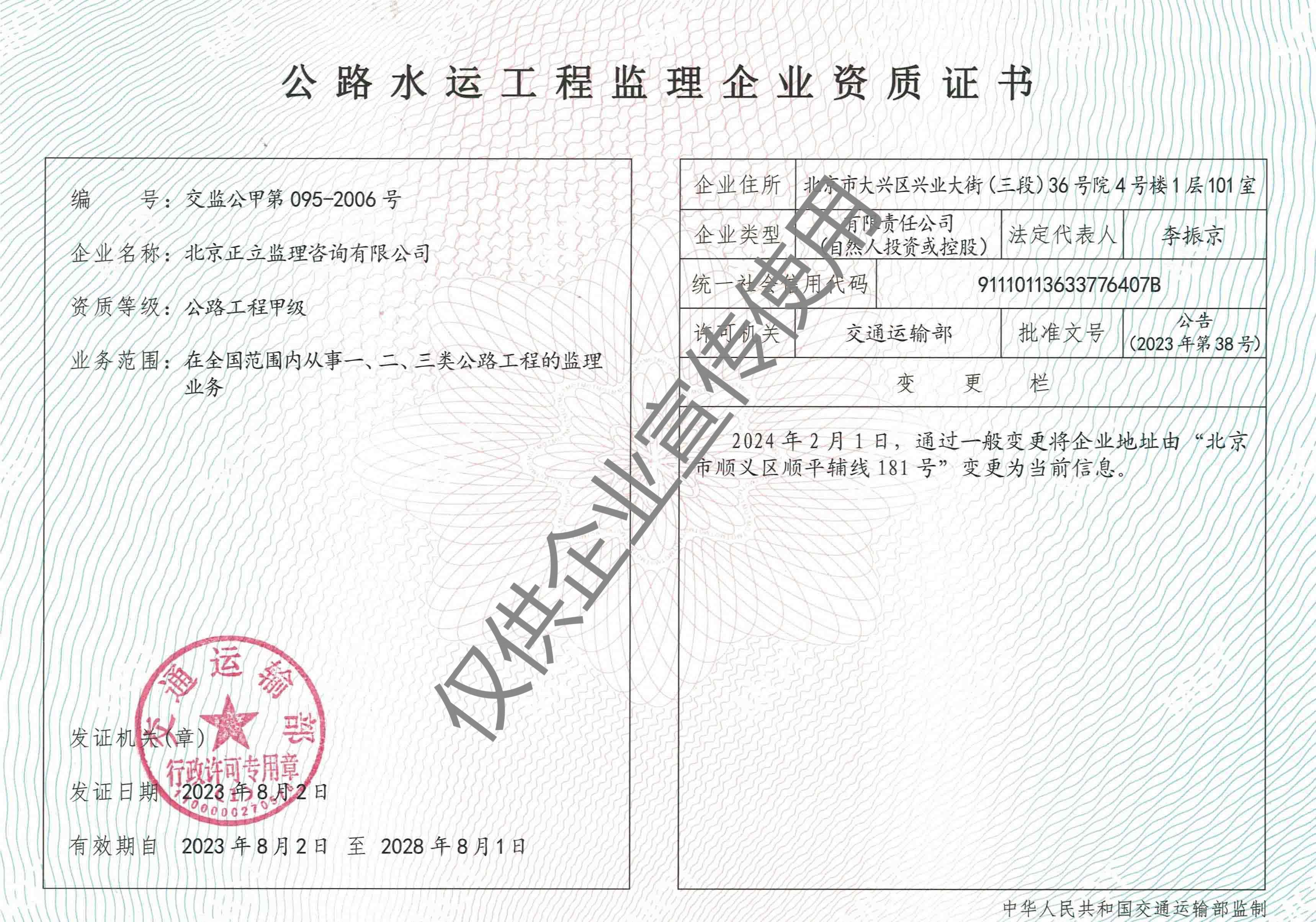 北京正立監(jiān)理咨詢有限公司成立于1998年7月1日,其前身隸屬于北京市公路質量監(jiān)理站。具有獨立法人資格,是獨立核算、自負盈虧的經(jīng)濟實體。企業(yè)經(jīng)營范圍:公路工程監(jiān)理、交通工程監(jiān)理、市政公用工程建設監(jiān)理、工業(yè)與民用建筑工程監(jiān)理、工程監(jiān)理咨詢、技術咨詢、技術培訓等。